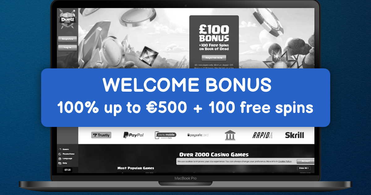 Duelz offers a 100% deposit match up to £100 plus 100 free spins on Book of Dead. The casino credits 20 spins per day for 5 days. The minimum deposit is £20. The platform auto credits the bonus with no code. The maximum bet with bonus funds is £2 per spin or bet. The bonus win cap is £500. Free spins wins cap at £100. Free spins expire after 3 days.